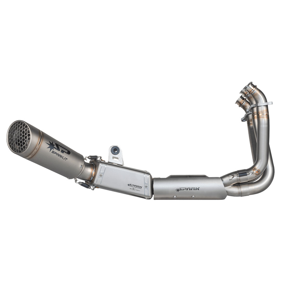 Il sistema completo integra collettori con BOX presilenziatore in acciaio inox AISI 304 e uno speciale catalizzatore racing altamente impregnato che consente di rispettare i requisiti omologativi europei con certificato rilasciato dal Ministero dei Trasporti italiano. Questo impianto migliora l’erogazione del tre cilindri Triumph e dona alla moto un sound cupo e avvolgente tipico degli scarichi Spark.