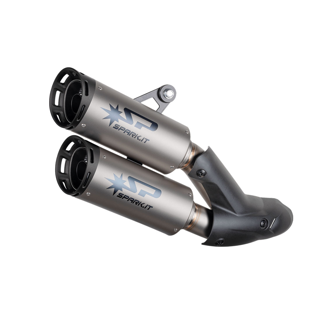 Lo slip-on Spark Exhaust a passaggio standard, con bivio in inox aisi 304 e coppia di silenziatori laterali Dyno di ultima generazione, molto corti, con un fondello di uscita in alluminio.